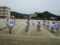 体育では折り返しリレーをしたり、たからとり鬼をしたりして、運動場を友達と一緒に走ることを楽しんでいます。たからとり鬼は、鬼の役の友達の間をすり抜けてボールをとる運動遊びです。